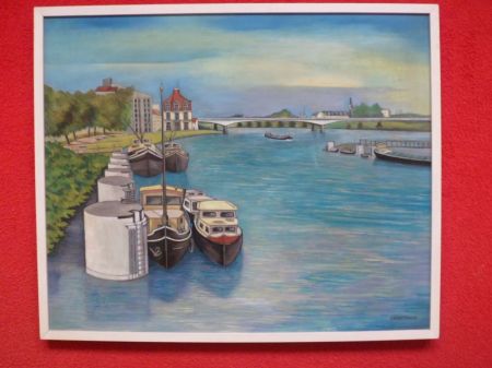 Prachtig olieverf op doek van de kunstenaar Leon Mortiaux uit Maastricht.Haven van Maastricht.Hij werd in 1915 geboren en overleed in 2001.Afmetingen 92x83 cm.Gesigneerd.